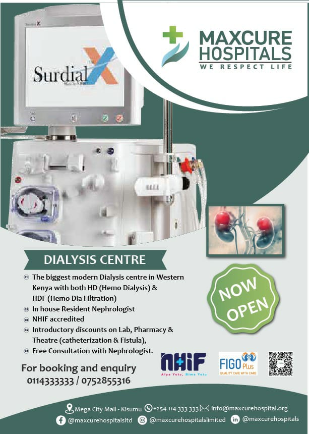 Located at Maxcure Hospital in Kisumu, our center offers comprehensive dialysis care utilizing advanced technology and compassionate practices. The facility is designed to enhance the quality of life for patients by providing effective dialysis treatment in a supportive and caring environment. Our team is dedicated to delivering top-notch care and ensuring that patients receive the support they need throughout their treatment journey.